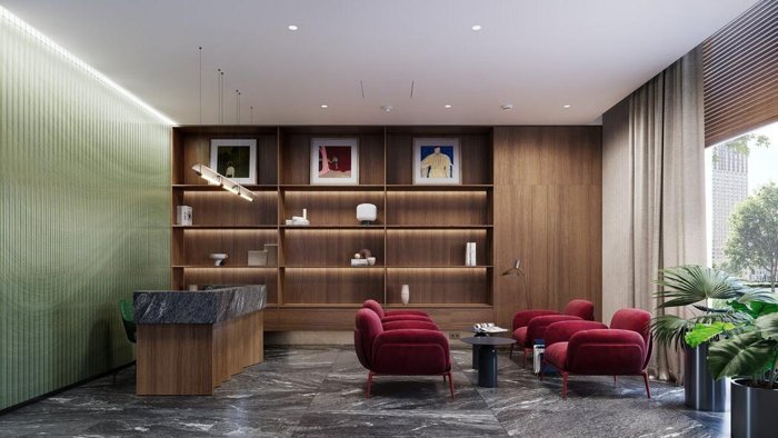 Дизайн интерьеров разработан международным бюро Blank Architects, известным такими проектами, как создание интерьеров для итальянского музея The Piscina Mirabilis, реконструкция набережной Генуи и проектирование Музея истории ХХ века в Берлине. Три лобби корпусов 4-й очереди — это три аутентичных пространства, где каждая деталь демонстрирует эволюцию материалов и архитектурных возможностей.