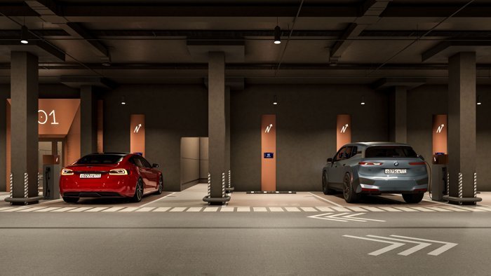 В проекте предусмотрен подземный паркинг, в том числе с возможностью зарядки электрокаров, мотоместами и местами для гостевых автомобилей.