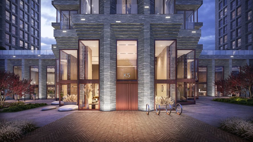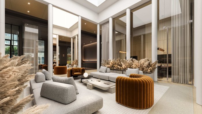 Дизайн лобби выполнен бюро BUROWHITE совместно с OSOME в стиле римских бань: в интерьере использованы материалы светлых тонов с контрастными лифтовыми холлами в шоколадном оттенке, строгие формы, стальные элементы «под латунь», дизайнерский свет, уютная мебель. В отделке используются высококачественные материалы: пол выполнен из керамогранита, стены: декоративные панели, покраска, натуральный камень. Гранд-лобби разработано по концепции сухих ног: из квартиры можно попасть в кафе на первом этаже, выйти в коворкинг, забрать доставку, получить письмо, встретиться с соседями.
