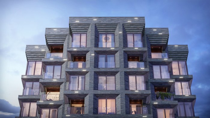 Фасады облицованы ригельным кирпичом аквамаринового цвета, что акцентно выделяет здания на фоне окружения. Доминанта — башня высотой 27 этажей — собирает архитектурный ансамбль в единое целое. Над проектом работало бюро Saga.
