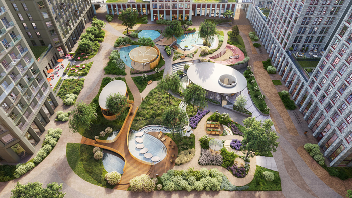 Особое внимание в проекте уделяется созданию функциональных пространств не только внутри дома, но и за его пределами. В ландшафтном парке «Среды на Лобачевского» расположены крытые зоны для спокойного времяпровождения, места для активного отдыха и спорта, коворкинг, соседский комьюнити-центр, водные объекты.