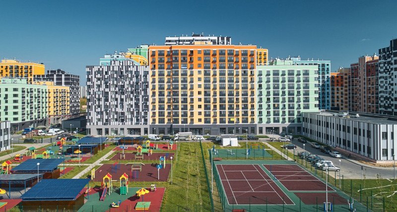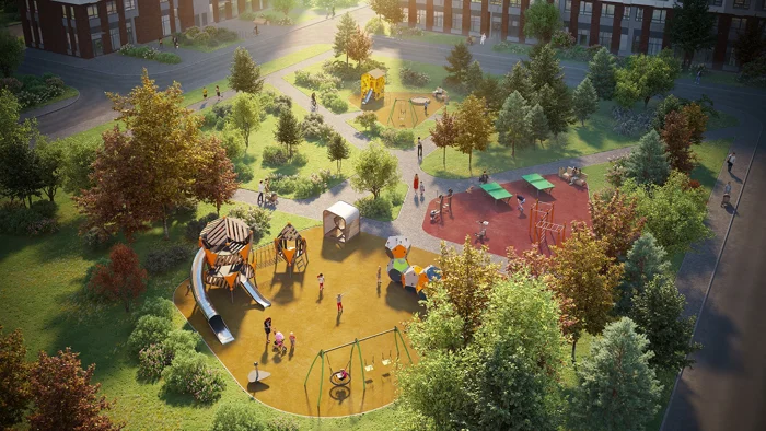 Часть внутренней территории комплекса засеяна газоном, здесь растут деревья и кустарники. Дворы, благодаря наличию подземных паркингов, сделаны свободными от машин. По центру жилого комплекса пройдет живописный зеленый бульвар — центральная улица всего микрорайона.