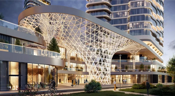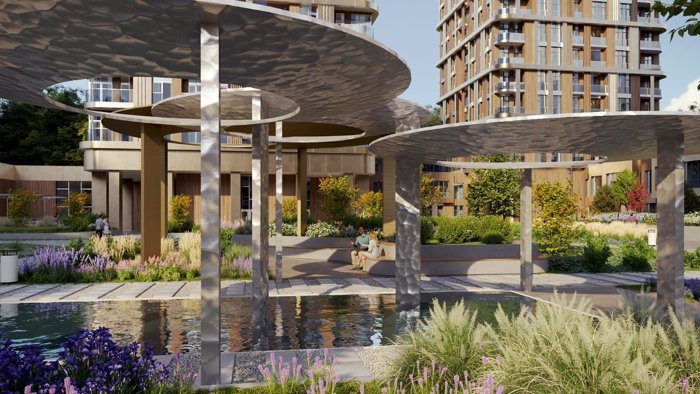 Центральное ядро внутреннего двора-парка представлено событийной площадью, Дождевой сад — неглубокий водоем, в который во время дождя водопадами устремляется вода, собирающаяся на поверхности навесов. Навесы выполнены из серебристого рифленого металла, создающего блики на водной глади. Навес над амфитеатром, более крупный по размерам, выполнен из бронзового гладкого металла, который в вечернее время отражает теплый свет окон и нижней подсветки и как бы светится изнутри.