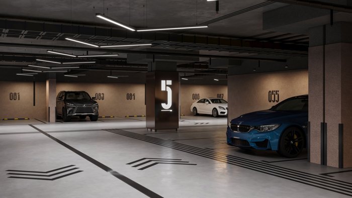 В проекте предусмотрен двухуровневый подземный паркинг, в том числе с возможностью зарядки электрокаров, мотоместами и местами для гостевых автомобилей. Для удобства и безопасности резидентов установлены системы бесключевого доступа по Bluetooth, круглосуточное видеонаблюдение, мойка колес на въезде, усилители сотовой связи и мобильного интернета. Вдоль стен предусмотрено хранение велосипедов, также есть станция подкачки колес и подзарядки средств индивидуальной мобильности.